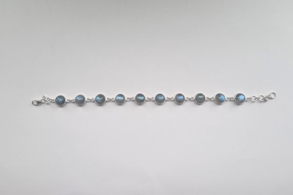 Deze verfijnde armband in 925 sterling zilver, met Labradoriet van uitstekende AA+ kwaliteit, straalt een mysterieuze elegantie uit. De gladgepolijste kralen van 9 tot 9,3 mm tonen een prachtig spel van blauw-grijze tinten met betoverende reflecties, die bij elke beweging subtiel oplichten en de aandacht trekken.