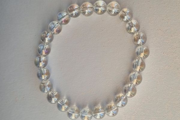 Deze schitterende Angel Aura kogelarmband is een opvallend accessoire dat elke outfit een sprankelende uitstraling geeft. Angel Aura is Bergkristal dat is behandeld met een combinatie van platina en zilver om een iriserende glans te creëren. Gemaakt van 8 mm Angel Aura-kogelstenen, is deze armband geregen op stevig elastiek voor een comfortabele en flexibele pasvorm. De stenen stralen een betoverende glans uit, met iriserende kleuren die variëren van zachte pasteltinten tot levendige schakeringen, waardoor de armband een magische uitstraling krijgt.