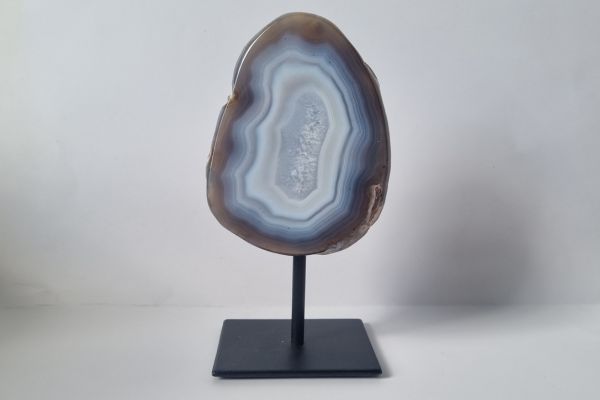Agaat staat bekend om zijn aardende en stabiliserende energie. De steen helpt innerlijke rust te vinden en brengt balans, zowel in je omgeving als in jezelf. Dit unieke stuk combineert de verfijnde schoonheid van gepolijst agaat met de authentieke uitstraling van ruwe steen, waardoor het een ware blikvanger is op zijn elegante standaard. Perfect als decoratief pronkstuk in huis, op kantoor of als spiritueel ankerpunt in je meditatiehoek.