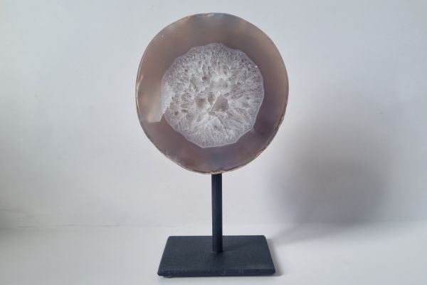 Agaat staat bekend om zijn aardende en stabiliserende energie. De steen helpt innerlijke rust te vinden en brengt balans, zowel in je omgeving als in jezelf. Dit unieke stuk combineert de verfijnde schoonheid van gepolijst agaat met de authentieke uitstraling van ruwe steen, waardoor het een ware blikvanger is op zijn elegante standaard. Perfect als decoratief pronkstuk in huis, op kantoor of als spiritueel ankerpunt in je meditatiehoek.