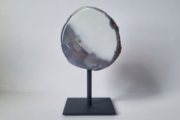 Agaat staat bekend om zijn aardende en stabiliserende energie. De steen helpt innerlijke rust te vinden en brengt balans, zowel in je omgeving als in jezelf. Dit unieke stuk combineert de verfijnde schoonheid van gepolijst agaat met de authentieke uitstraling van ruwe steen, waardoor het een ware blikvanger is op zijn elegante standaard. Perfect als decoratief pronkstuk in huis, op kantoor of als spiritueel ankerpunt in je meditatiehoek.