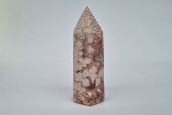Deze obelisk van Floweragaat, ook wel Bloemagaat genoemd, valt direct op door zijn zachte, dromerige uitstraling. De steen heeft een romige basiskleur waarin delicate insluitsels zichtbaar zijn die doen denken aan bloesems of bloemen in nevel. Elk stuk is uniek, alsof de natuur zelf een schilderij heeft gemaakt. In obeliskvorm komt de kracht en elegantie van de steen mooi samen: recht omhoog, stevig en toch verfijnd.