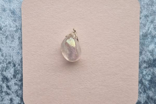 Laat je betoveren door de hemelse uitstraling van deze Angel Aura hanger. De steen, oorspronkelijk een pure Bergkristal, is op een bijzondere manier bewerkt met platina en zilver, wat zorgt voor een stralende, iriserende glans die verandert door de lichtinval. De warme messing bell cap geeft een luxe uitstraling aan de Angel Aurasteen.